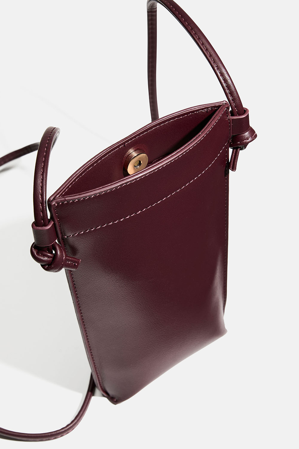 Stilren mobiltaske i vinrødt imiteret læder med magnetlukning. Kan anvendes på flere måder – rundt om halsen, crossbody eller over skulderen.