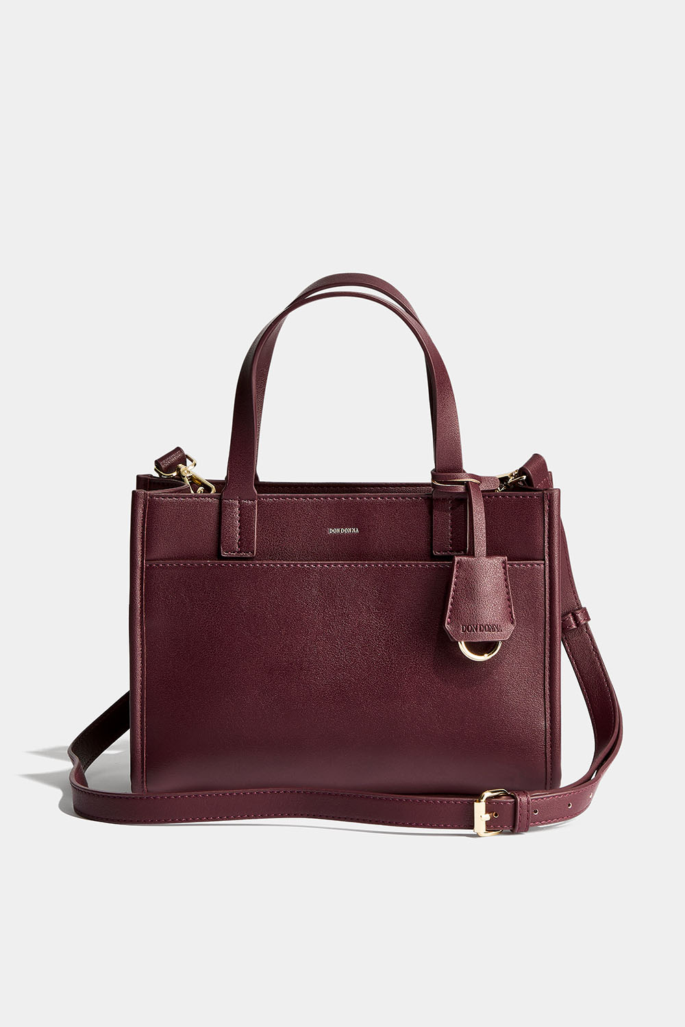 Vinrød taske med guldfarvet Don Donna-logoet foran. Tasken har to håndtag og en aftagelig skulderrem. Tasken har et større rum, der lukkes med lynlås og to mindre rum indeni. Skulderremmen er aftagelig og justerbar, så du også kan have tasken på som crossbody.